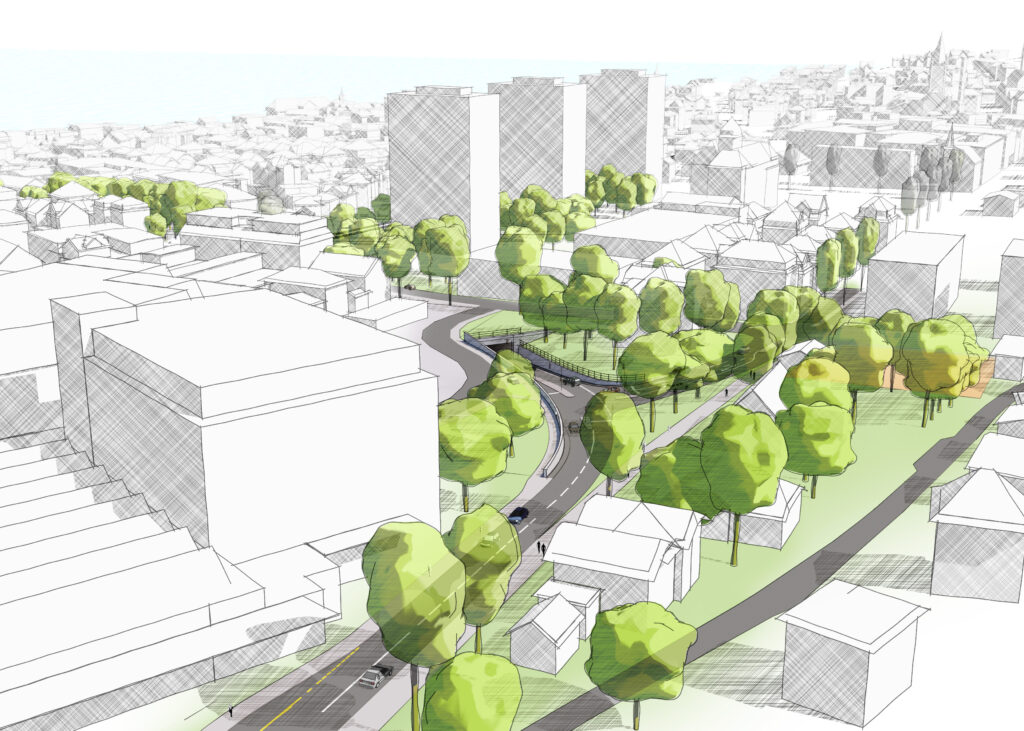 Am Knoten Pestalozzistrasse wird die bestehende Ost-West-Verbindung an die Kantonsstrasse zum See angeschlossen. Das Alters- und Pflegezentrum Helios wird an einen neuen Standort verlegt. Das denkmalgeschützte Hauptgebäude bleibt bestehen.